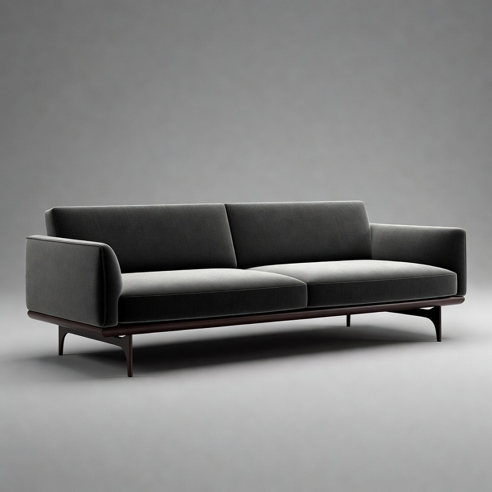 3D render, contemporary design, dark gray, fabric sofa, gray sofa, high-end couch, home furniture, isolated background, living room couch, luxury sofa, minimalist furniture, neutral tones, scandinavian style, seating, slim legs, two-seater sofa, upholstery, velvet upholstery, wooden legs, modern sofa