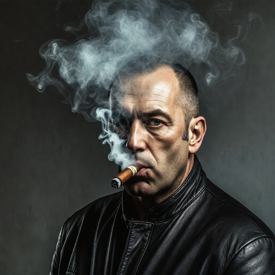 A middle-aged man with a shaved head smokes a thick cigar, with dense smoke swirling around his intense face. He wears a black leather jacket and gazes directly at the viewer against a dark gray background. His expression is stern and focused.