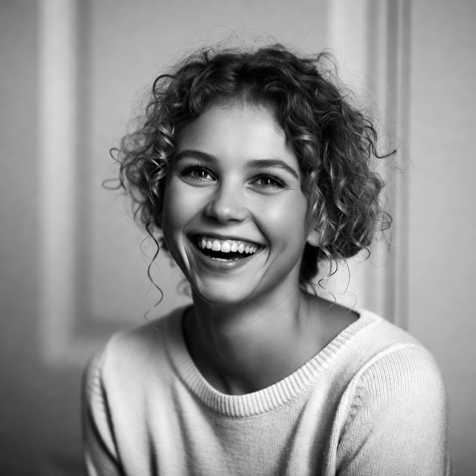 White, beautiful smile, black and white, closeup, curly hair, eyes smiling, female, frizzy hair, happy face, headshot, indoor, joyful expression, monochrome, natural hair, portrait, smiling, sweater, teeth showing, young woman, woman