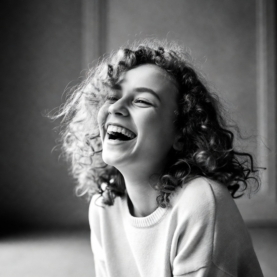 A young woman with voluminous curly hair smiles broadly while laughing in a black and white portrait. She wears a light-colored sweater and is positioned against a softly lit paneled background. Her face is turned slightly, capturing her joyful expression with eyes squinted in mirth.