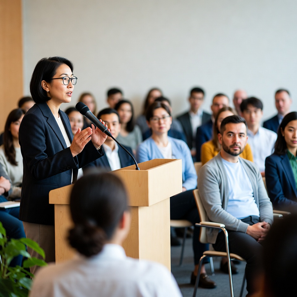 Asian, Asian men, Asian women, audience, business attire, business suit, conference, diverse crowd, female, gesturing hand, glasses, meeting, microphone, modern room, podium, potted plant, professionals, public speaking, seated audience, wood walls, wooden podium, woman speaking