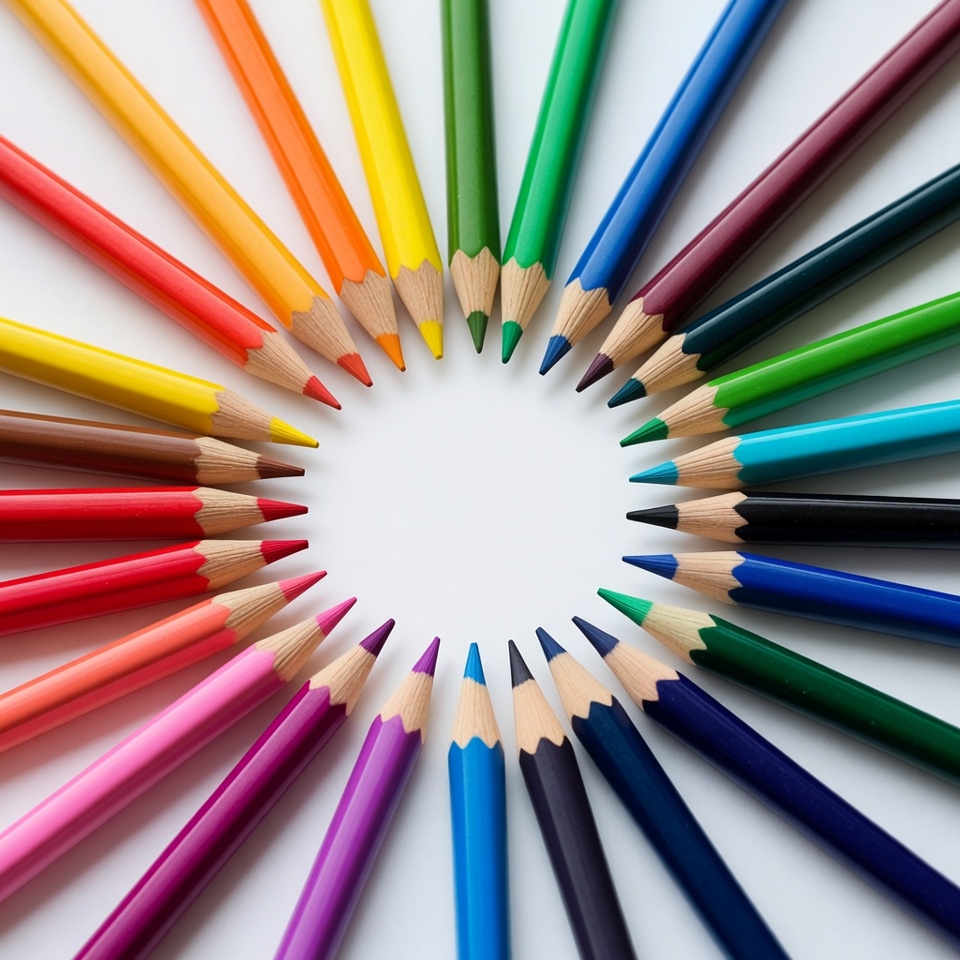 A vibrant collection of colored pencils is arranged in a perfect circle on a white background. The pencils radiate outward with sharpened tips pointing toward the center, showcasing a full spectrum of colors including red, orange, yellow, green, blue, purple, and more. The composition leaves an empty circular space in the middle.