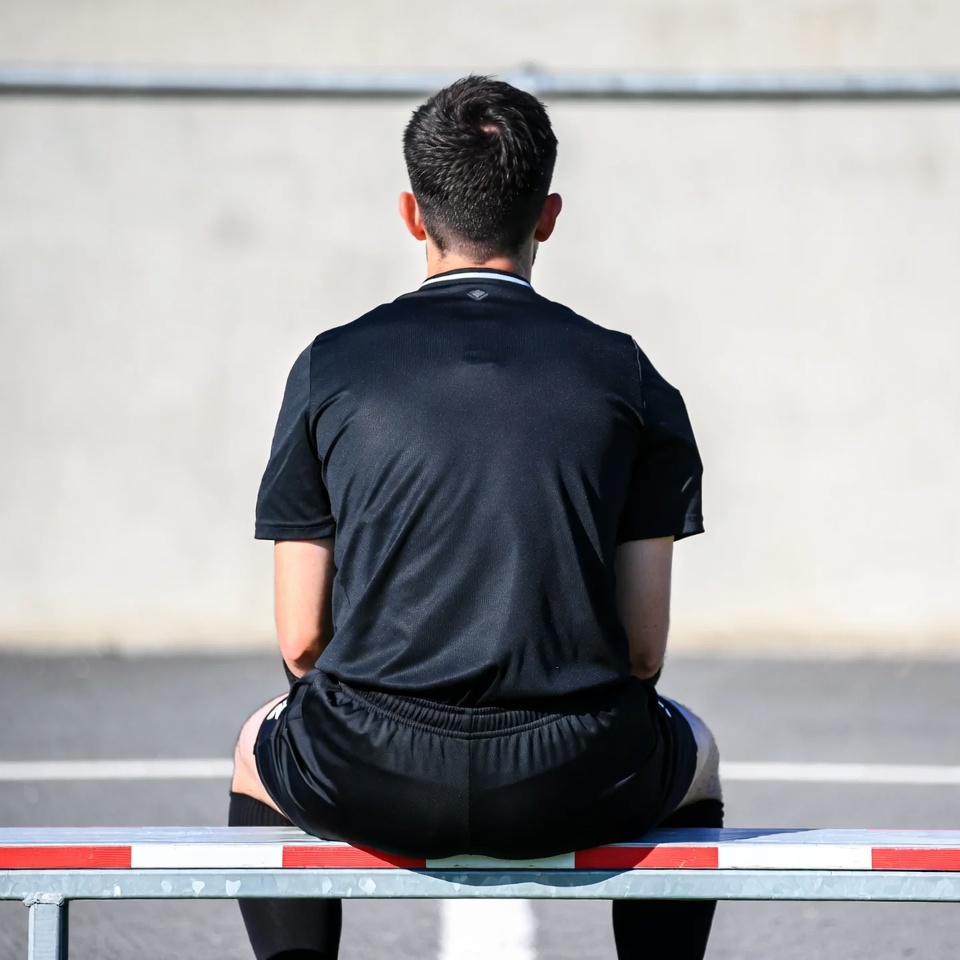 athlete, back view, bench, black uniform, chain-link fence, football referee, male, man, outdoor, referee, shorts, sitting, sitting bench, soccer field, socks, sports, sports field, stadium bench, soccer referee