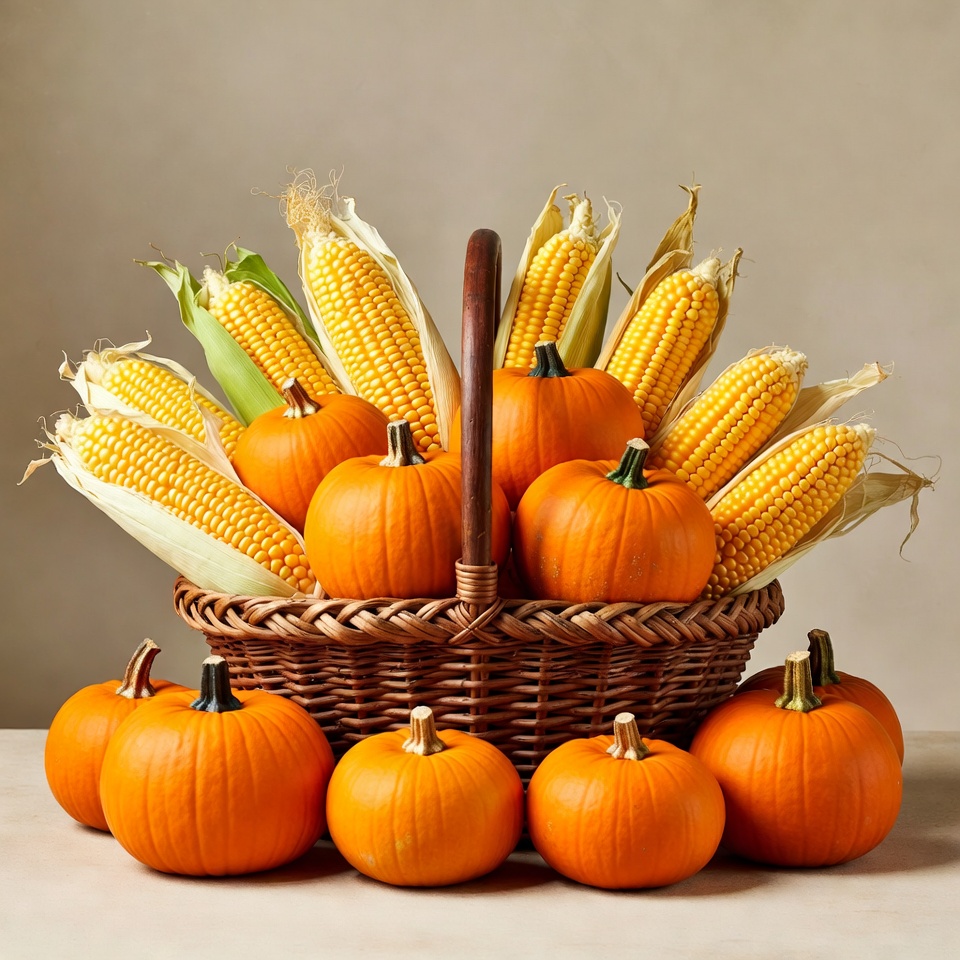 A woven basket filled with orange pumpkins and ears of corn sits on a neutral surface. The corn has golden husks and kernels, arranged around small and medium-sized pumpkins. The composition is centered and displayed against a light gray background.