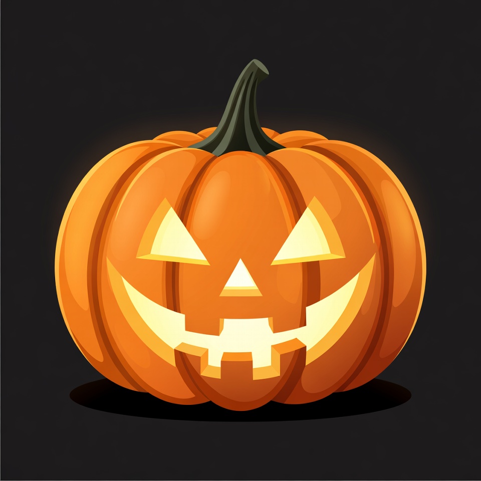 Halloween, autumn, black background, cartoon pumpkin, carved pumpkin, clipart, festive, glowing eyes, green stem, illustration, isolated background, orange, orange pumpkin, pumpkin, smiling face, spooky, yellow glow, jack-o-lantern