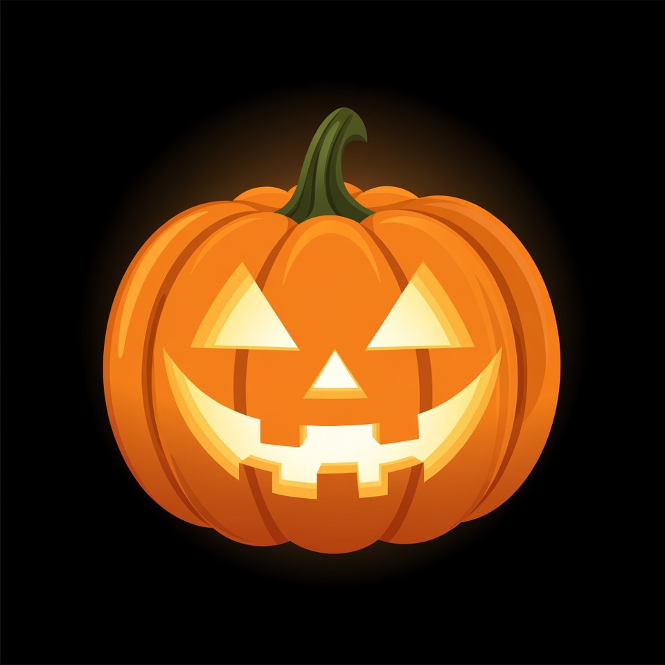 A vibrant orange jack-o'-lantern pumpkin with a carved smiling face glows brightly against a black background. It features triangular eyes, a wide jagged mouth, and a green stem on top. The illustration has a cheerful Halloween design with glowing yellow light from within.