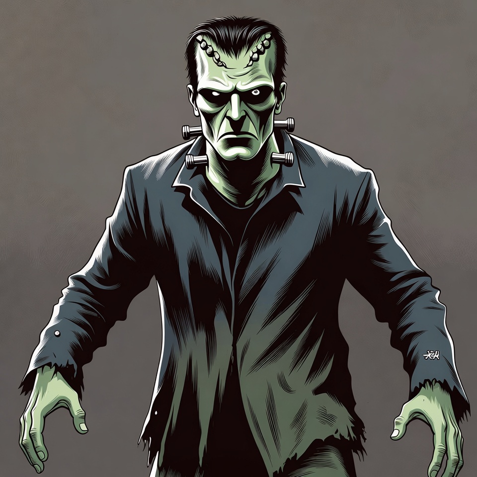 A detailed cartoon illustration of Frankenstein's monster with green skin, black hair, and neck bolts stands against a gray background. He wears a tattered black suit with wide-open arms and a stern expression. The artwork features bold black outlines and dramatic shading.