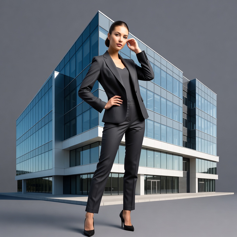A young Asian woman in a sleek gray pantsuit stands confidently with hands on hips in front of a modern glass office building. She has dark hair in a bun and wears black high heels. The towering building features reflective blue-tinted windows and white accents on a gray background.