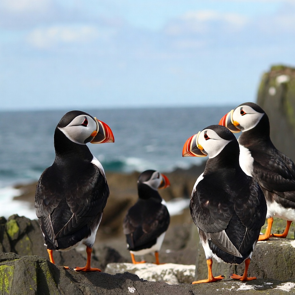 Several Atlantic puffins stand closely together on a rocky cliff overlooking the ocean. They have distinctive black and white plumage, colorful orange beaks, and bright yellow legs. Waves crash against the rocks below under a partly cloudy sky.