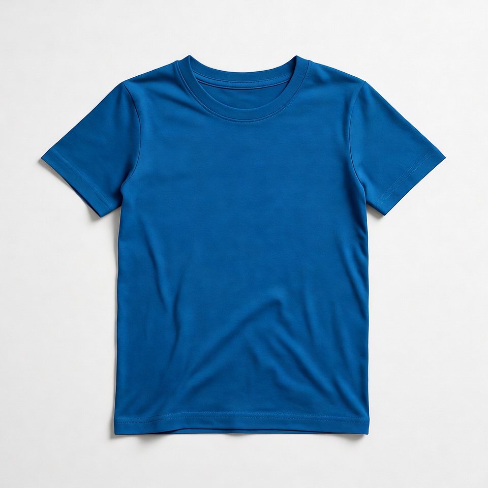 apparel, blank shirt, casual shirt, childrens wear, clothing, crew neck, isolated background, kids shirt, plain t-shirt, short sleeve, tshirt, white background, youth t-shirt, blue t-shirt