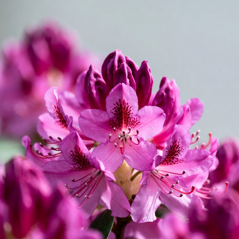 A cluster of vibrant pink rhododendron flowers is captured in close-up against a soft gray background. The blooms feature layered magenta petals with red speckled centers and protruding stamens. Surrounding buds and green leaves add depth to the floral arrangement.