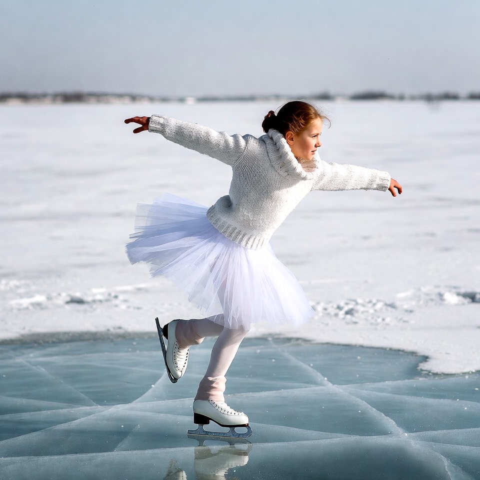 A young girl with red hair in a bun wears a white sweater and tutu skirt while ice skating on a frozen lake. She glides with arms extended and one leg lifted behind her on the cracked ice surface. Her white skates are visible against the snowy landscape and blue sky.