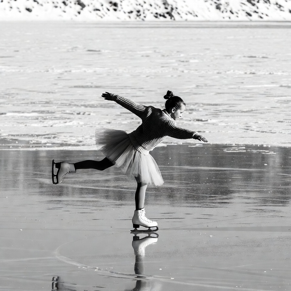 A young girl in a sweater and tutu skates gracefully on a frozen lake in black and white. She extends her arms for balance with one leg lifted behind her, wearing white ice skates. Snowy mountains rise in the background, and her reflection is visible on the ice.