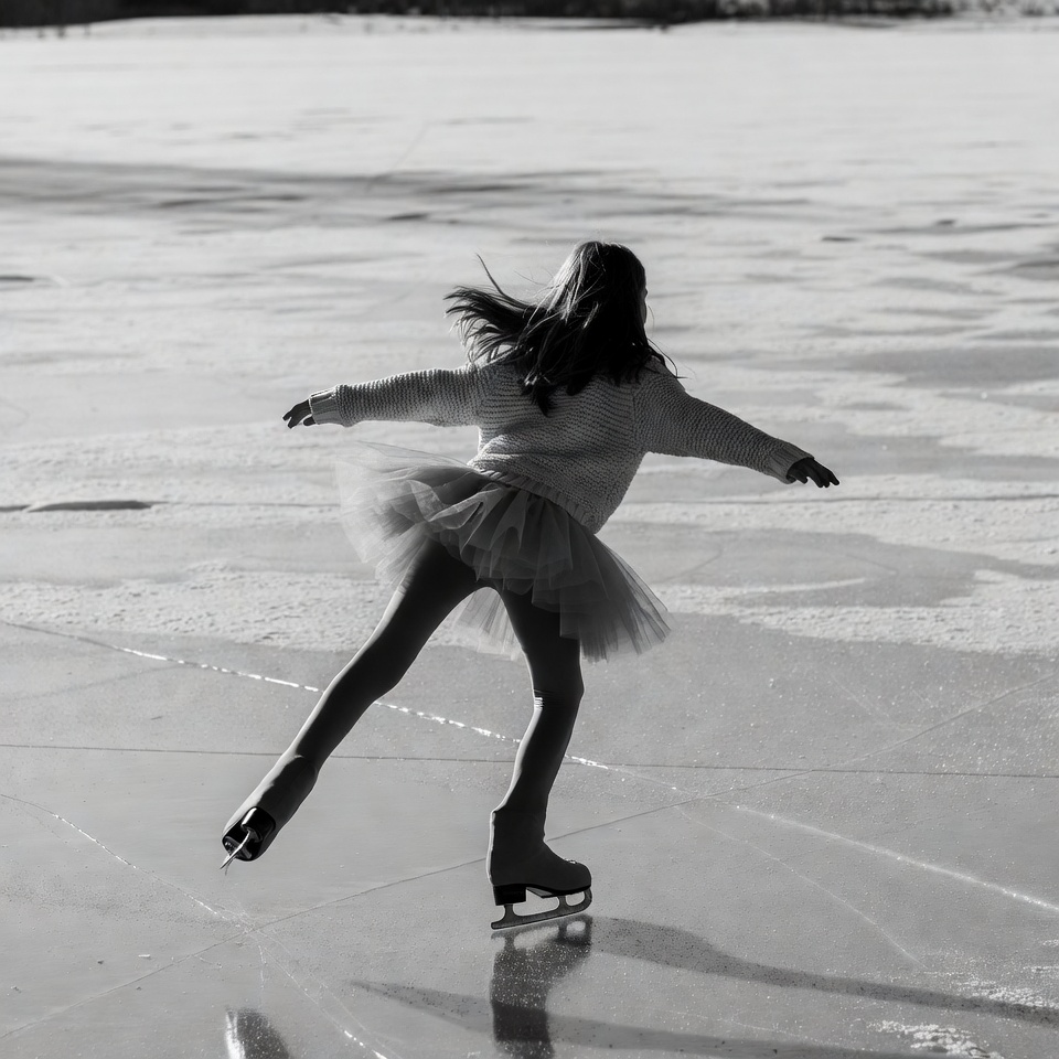 A young girl with long hair skates gracefully on a frozen lake in black and white. She wears a sweater and tutu skirt with ice skates, captured from behind in motion with arms outstretched. Her reflection is visible on the ice under a winter sky.