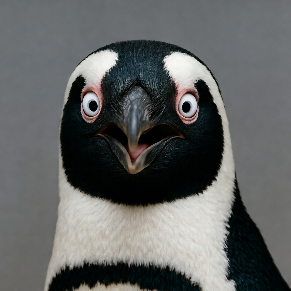 animal, avian, bird, black feathers, black-footed penguin, close-up, isolated background, open beak, red eyes, seabird, surprised expression, white markings, wide eyes, wildlife, penguin