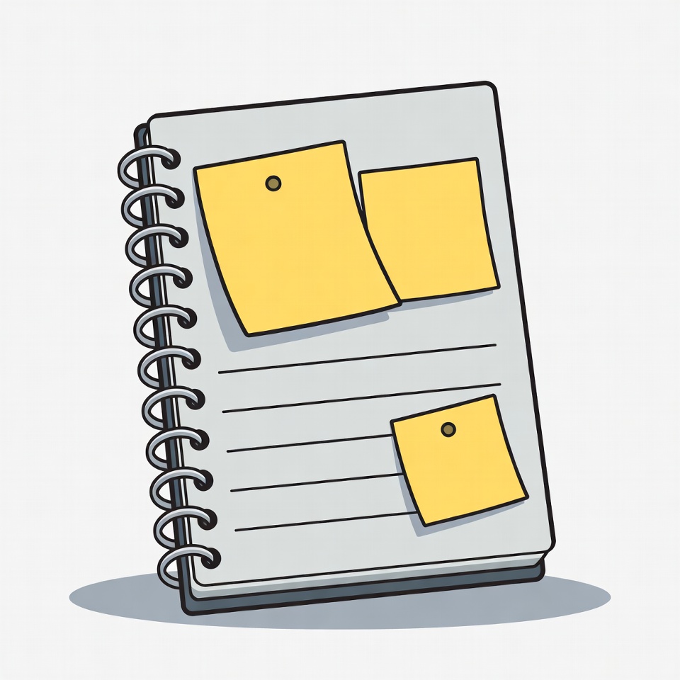 A cartoon illustration of a spiral-bound notebook with lined gray pages stands tilted on a white background. Several yellow sticky notes are attached to its cover and pages, some curling at the edges. The notebook features silver spiral binding and subtle shadows for depth.