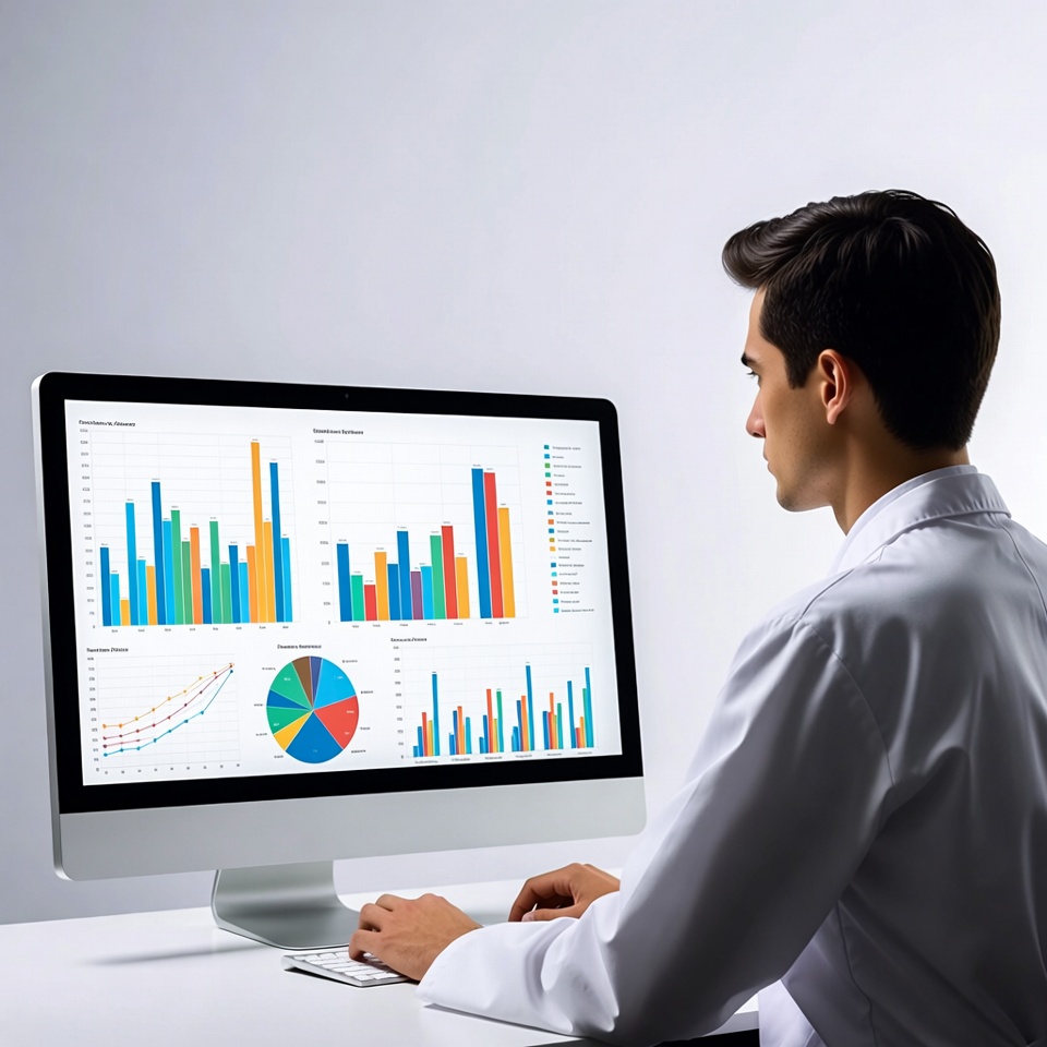 A man in a white lab coat sits at a desk, viewing multiple colorful charts and graphs on a large computer monitor. He is typing on the keyboard while focused on the data visualizations including bar graphs, line charts, and pie charts. The background is plain white.