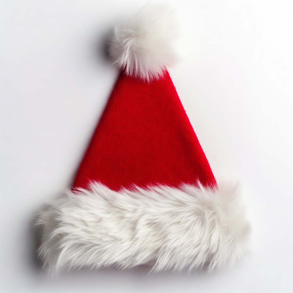 Christmas accessory, Christmas hat, Santa Claus hat, clipart, festive hat, fur trim, holiday hat, illustration, isolated background, pom-pom, red hat, white background, white fur, winter hat, Santa hat