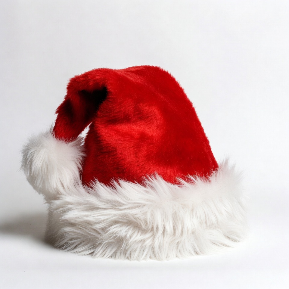 Christmas accessory, Christmas hat, Santa Claus hat, festive hat, fluffy trim, holiday accessory, holiday hat, isolated background, plush hat, pom pom, red Santa, red hat, white fur, white pom-pom, winter hat, Santa hat