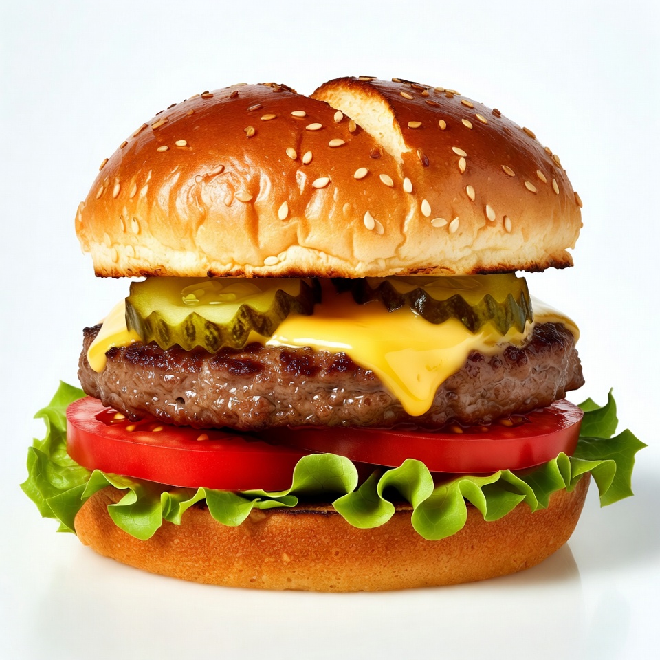 beef burger, beef patty, burger, cheese slice, classic burger, delicious burger, fast food, food closeup, food photography, fresh vegetables, gourmet burger, green lettuce, hamburger, hamburger bun, isolated background, juicy burger, lettuce, melted cheese, pickle slices, pickles, sesame bun, tomato, tomato slices, white background, yellow cheese, cheeseburger