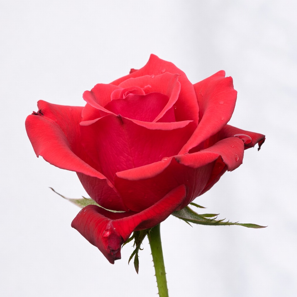 blooming rose, botany, closeup, dew drops, floral, flower, fresh rose, garden flower, isolated, nature, petals, red flower, romantic flower, rose bloom, rose flower, stem, thorns, water droplets, white background, red rose