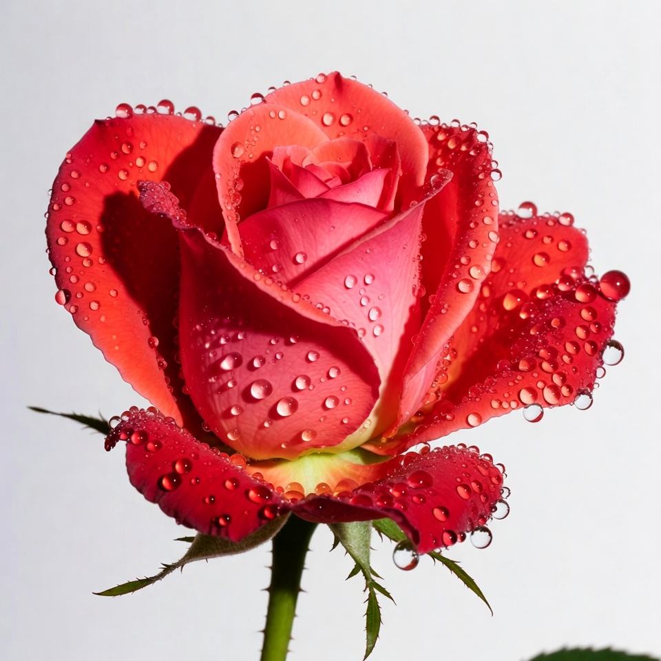 bloom, closeup rose, dew drops, dewdrop, floral, flower, flower photography, fresh rose, garden flower, green stem, nature, petals, pink petals, rose, rose bloom, rose flower, water droplets, wet rose, white background, red rose