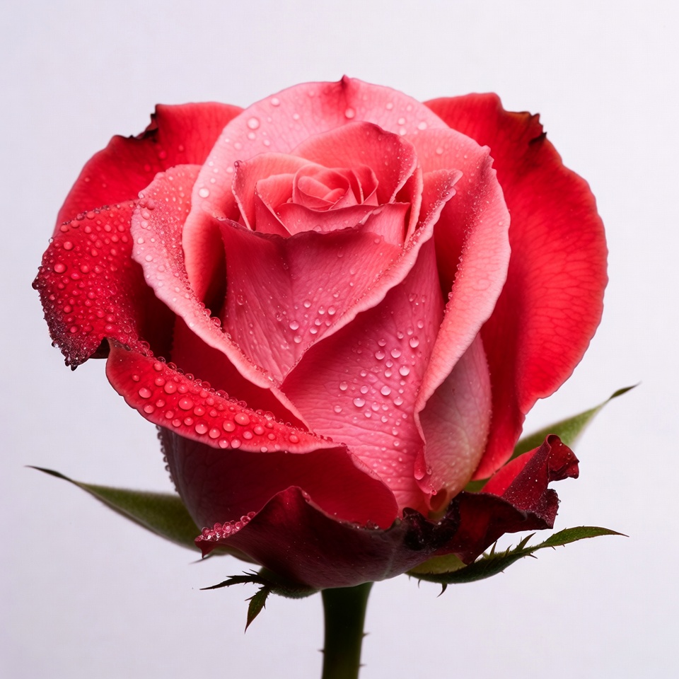 blooming rose, botany, dew drops, floral, flower closeup, fresh rose, garden flower, isolated background, leaves, nature, petals, red edges, rose flower, stem, water droplets, white background, pink rose