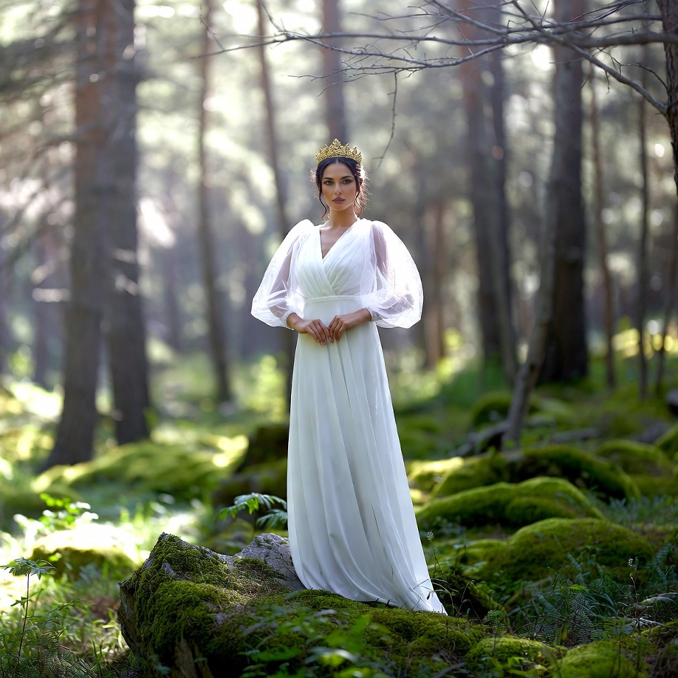 A woman with dark hair and a golden crown stands on a mossy rock in a dense forest. She wears a flowing white gown with sheer long sleeves and holds her hands clasped at her waist. Sunlight filters through the tall pine trees, illuminating the green moss and branches around her.