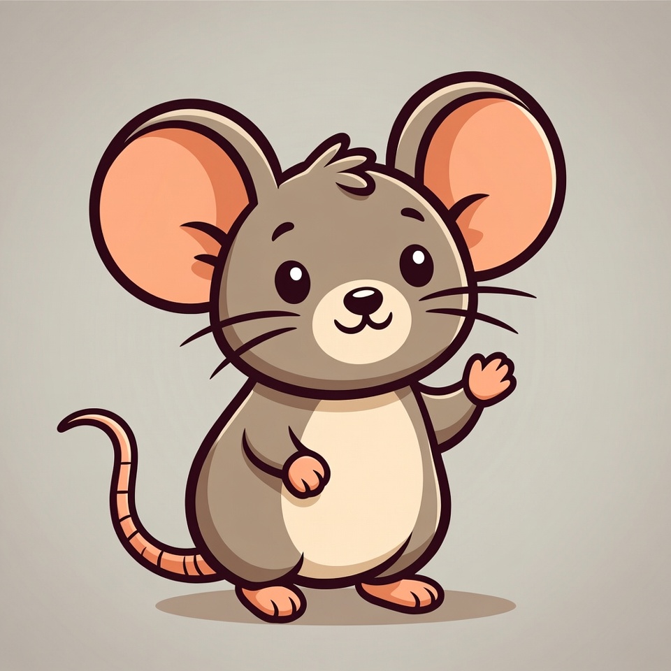 A cute gray mouse with large orange ears waves its paw in a friendly greeting. It has big sparkling eyes, a small smiling mouth, and a long curly tail. The illustration features a simple isolated background with soft shadows.