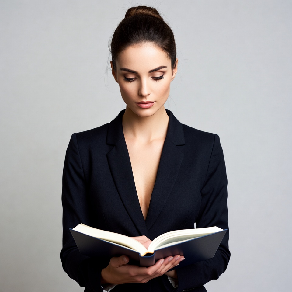 A woman with dark hair in a bun wears a black blazer with a deep neckline and holds an open book in her hands. She gazes downward intently at the pages. The image features a plain gray background.