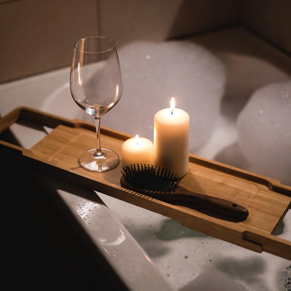 bamboo tray, bath accessories, bath tray, bathroom, bubble bath, bubbles, candles, hairbrush, lit candles, relaxation, spa, white candles, wine glass, wooden tray, bathtub