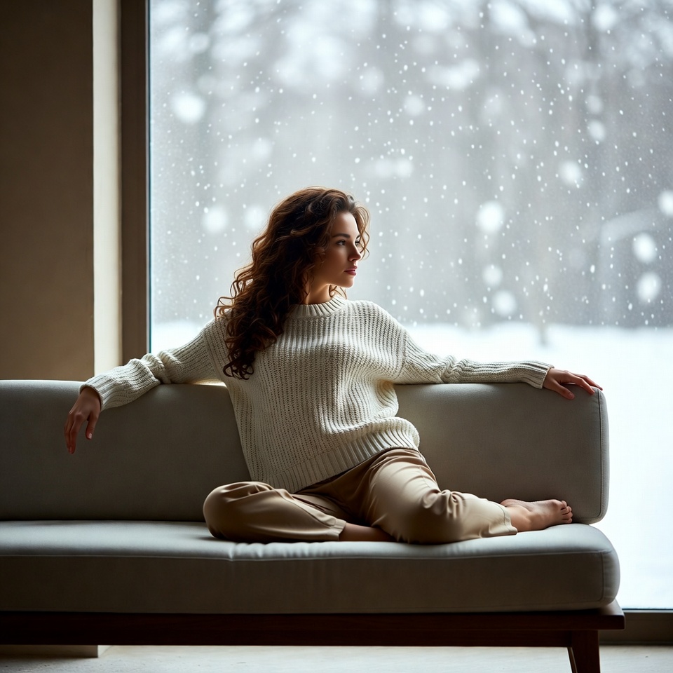 A woman with long curly brown hair sits on a light gray sofa, wearing a white turtleneck sweater and beige pants. She leans back with arms extended along the sofa, barefoot, and gazes thoughtfully through a large window. Outside the window, heavy snow falls against a wintery backdrop.