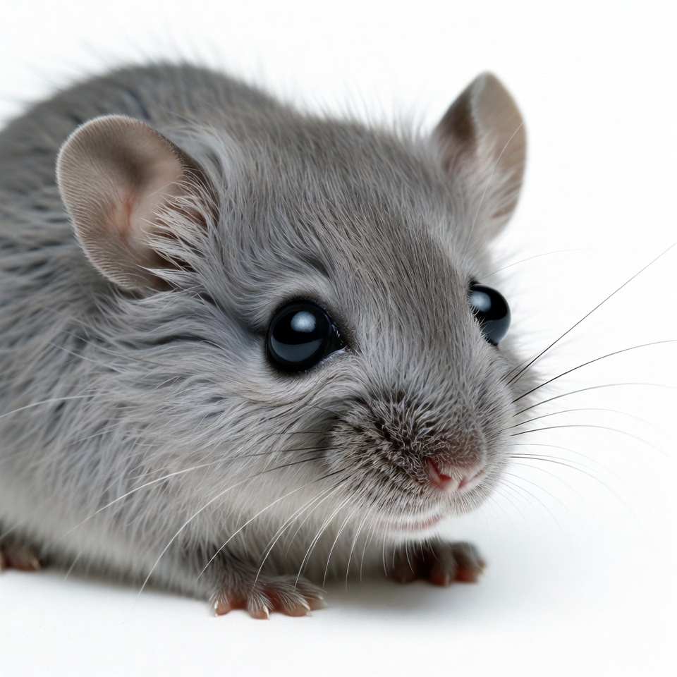 A fluffy gray mouse with large black eyes stares forward on a plain white background. Its pink nose and tiny paws are visible, and it has soft fur with prominent whiskers. The mouse appears curious with slightly open mouth.