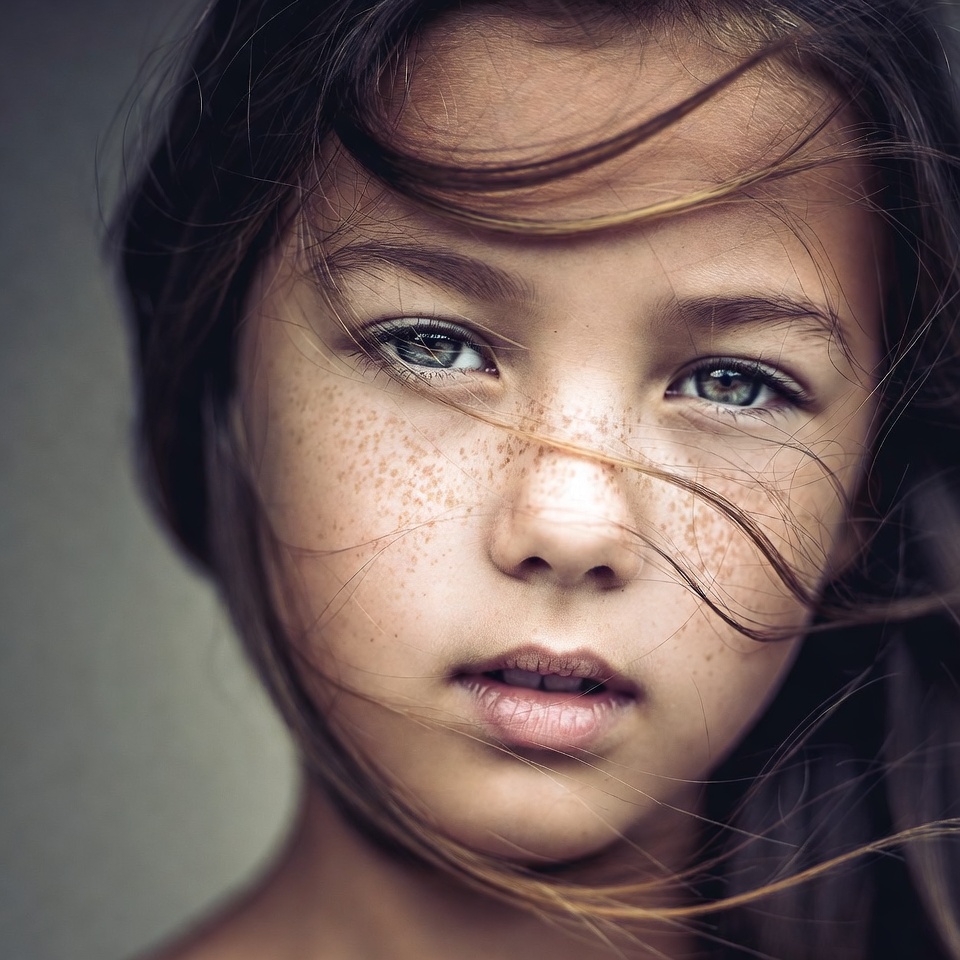 A young girl with long brown hair blowing across her face gazes at the viewer. She has prominent freckles on her cheeks and nose, and large green eyes. Her expression is soft and her lips slightly parted.