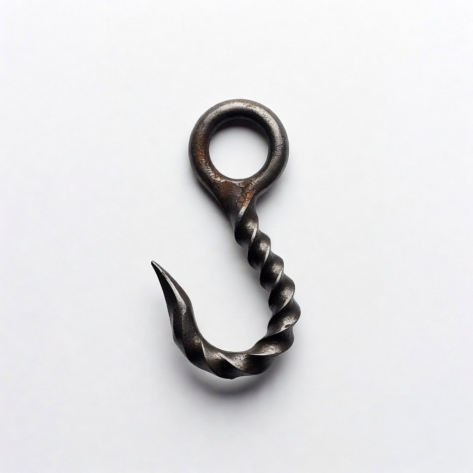 black iron, blacksmith hook, eye hook, forged hook, hanging hook, heavy duty hook, hook, industrial hook, isolated, meat hook, metal hook, pointed hook, rustic hook, spiral hook, twisted hook, vintage hardware, white background, iron hook