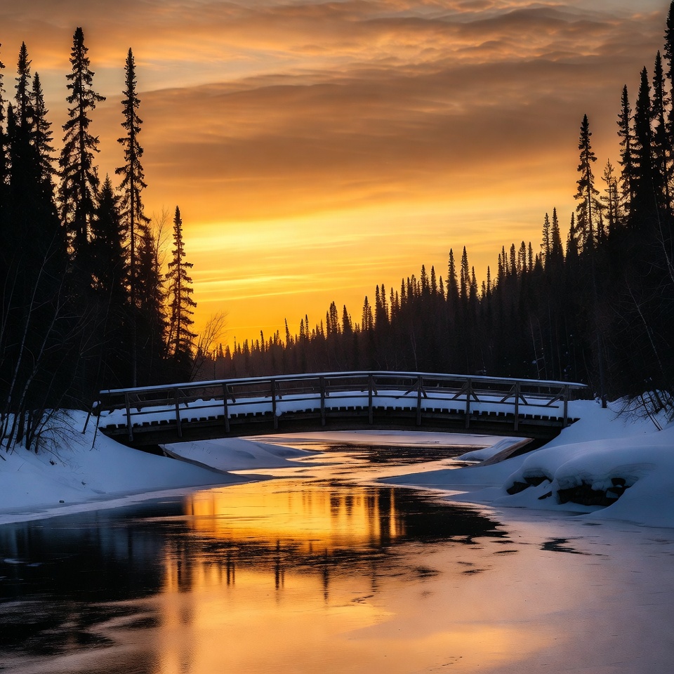 A wooden bridge arches over a partially frozen river surrounded by snow-covered spruce trees. The scene is bathed in vibrant orange and golden hues from a dramatic sunset sky. The river's icy surface reflects the colorful sky and bridge.