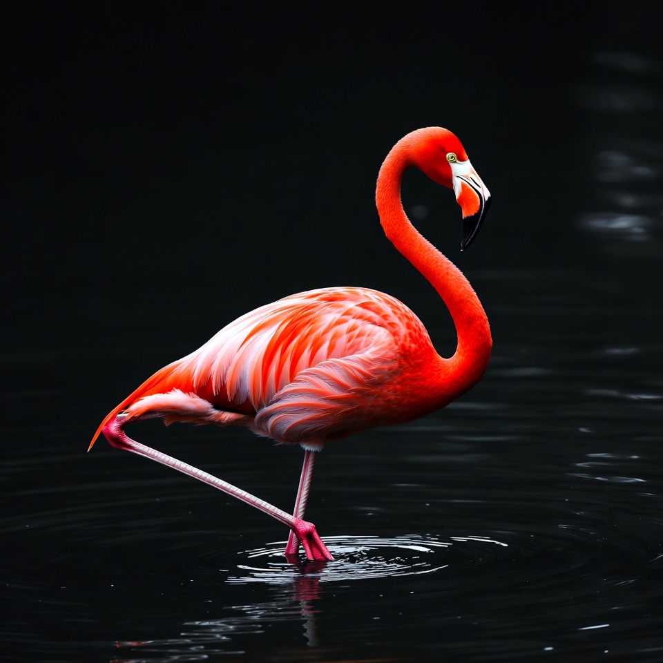 bird, black background, exotic bird, feathers, green eyes, isolated background, long neck, pink flamingo, red beak, standing, wading bird, water, wildlife, flamingo