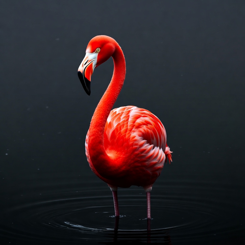 A vibrant red flamingo stands gracefully in shallow dark water on a black background. Its long neck is curved elegantly with a black-tipped beak facing forward. The bird's feathers show intricate pinkish-red patterns and thin legs support its plump body.