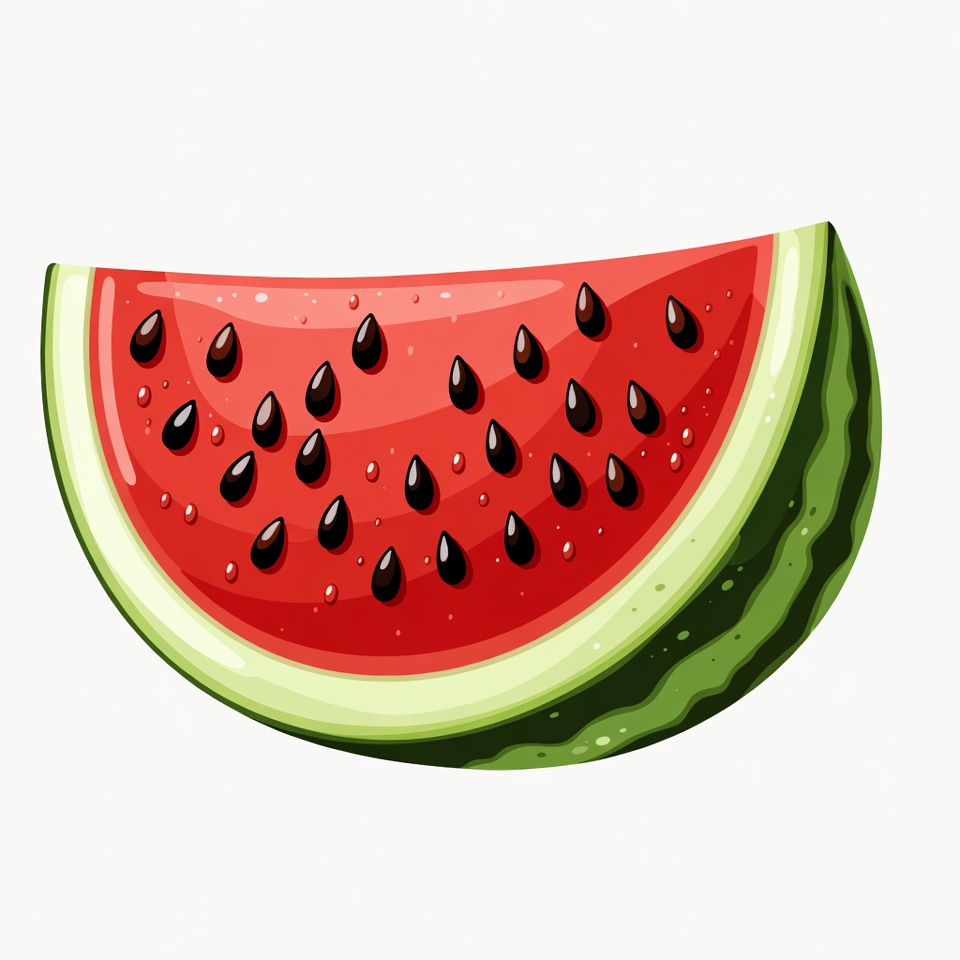 A vibrant illustration of a watermelon slice with juicy red flesh, black seeds, and green rind. The slice is cut in half and shown on a white background. Water droplets glisten on the surface.