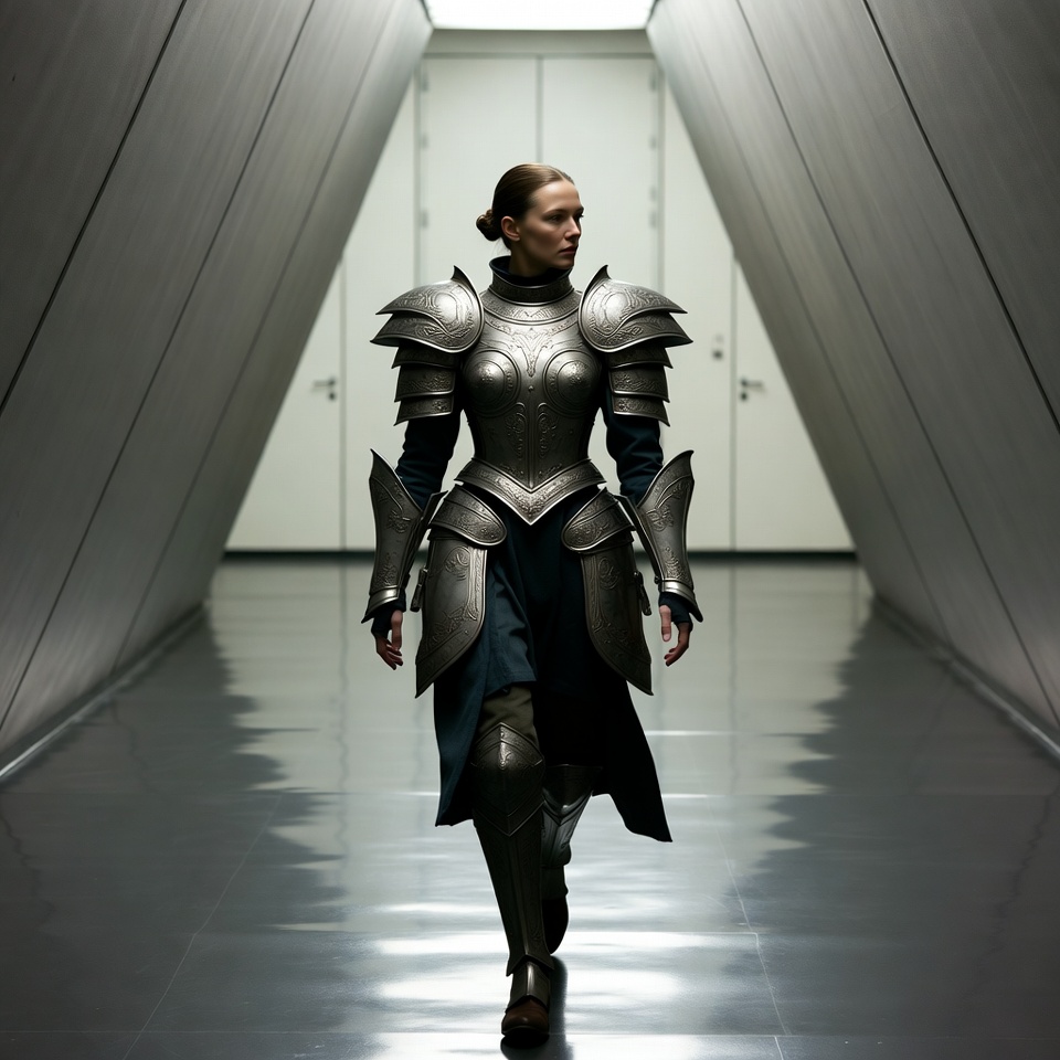 White, angled walls, armored woman, bright lighting, bun hairstyle, corridor, double doors, fantasy, female, futuristic armor, gray walls, hallway, indoor, medieval armor, metallic armor, narrow hallway, ornate armor, sci-fi, sci-fi knight, shoulder pauldrons, walking, warrior woman, woman