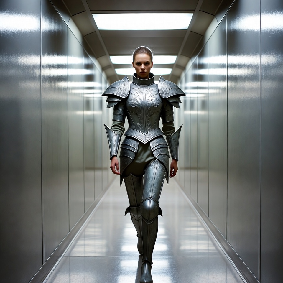 A woman with her hair in a bun wears intricate metallic futuristic armor and walks down a long, narrow corridor with shiny metallic walls. She strides confidently toward the camera under bright overhead lights. The armor features detailed pauldrons, gauntlets, and greaves in a sleek silver design.