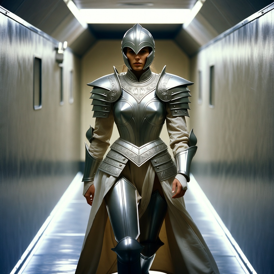 A woman wearing ornate silver medieval armor with a helmet walks down a futuristic metal corridor. She has flowing white fabric accents on her pauldrons and skirt, and her arms are extended slightly. The corridor features overhead lighting and dark blue walls with small windows.
