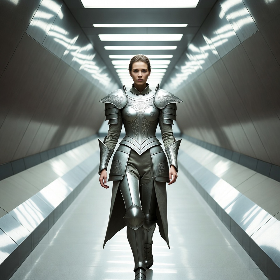 White, armor, boots, brown hair, female, full body, futuristic corridor, gauntlets, knight, medieval armor, metallic hallway, overhead lights, plate armor, ponytail, reflective walls, sci-fi, silver armor, symmetric, walking, warrior, woman