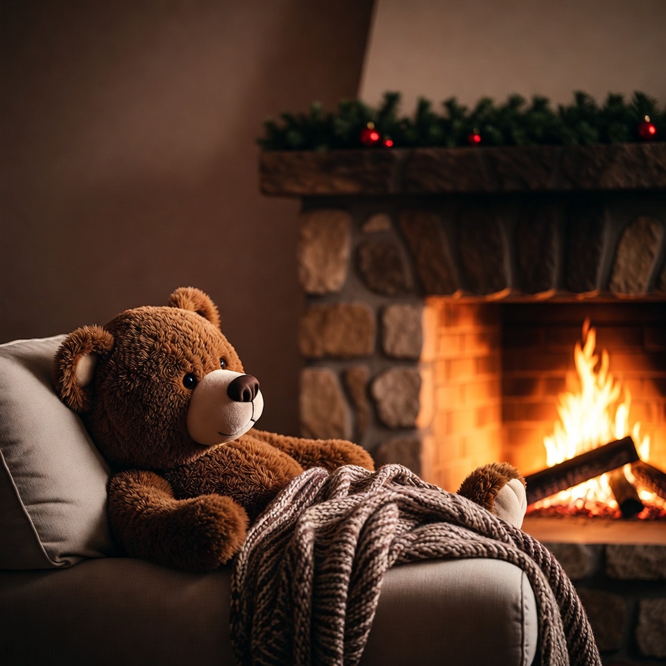 A plush brown teddy bear lounges on a white armchair in front of a stone fireplace with a warm fire burning. It is covered by a knitted gray blanket and surrounded by Christmas garland with red ornaments on the mantel. The cozy indoor scene features soft lighting and wooden elements.