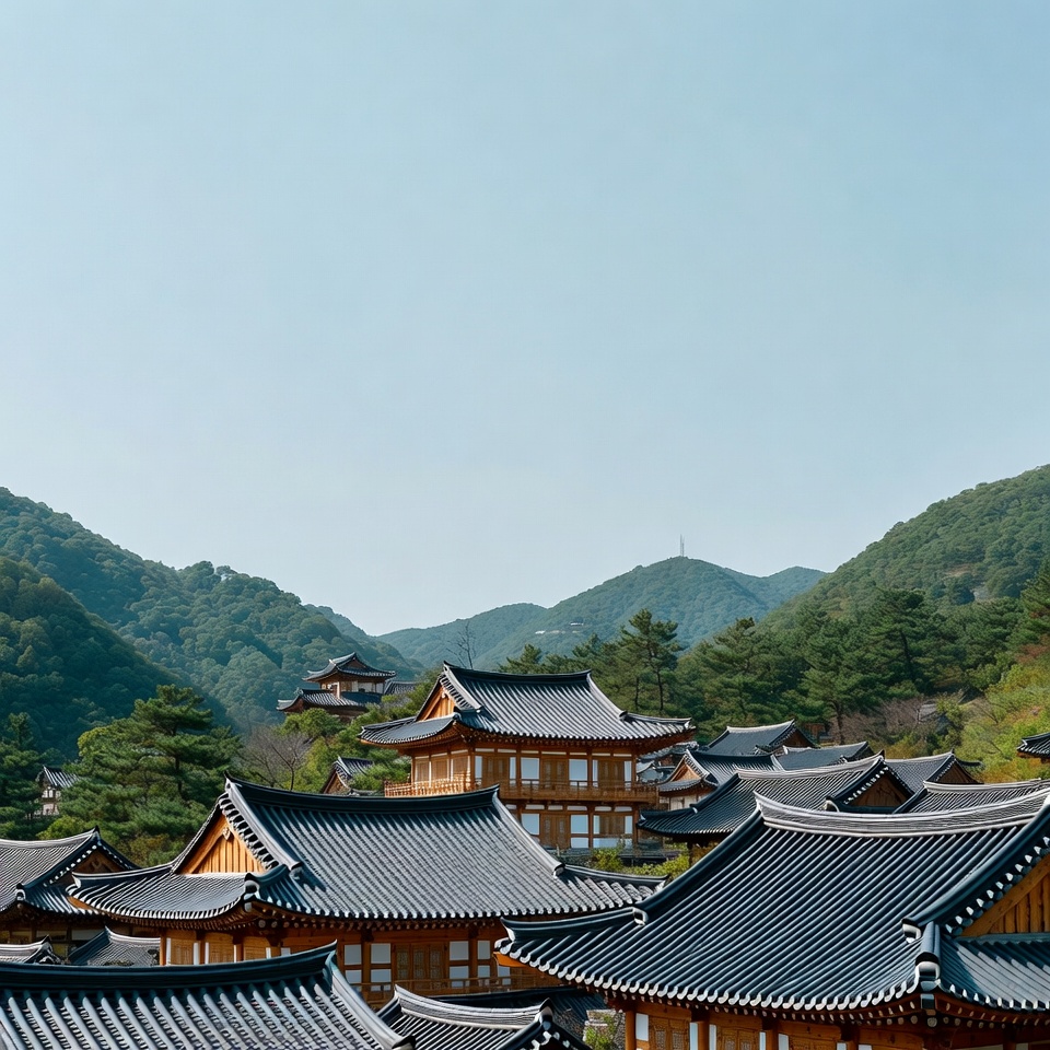 Buddhism, East Asian, South Korea, aerial view, autumn foliage, black tiles, blue sky, cultural heritage, curved eaves, forest, green hills, hanok style, historic site, landscape, mountains, nature, pagoda, pine trees, ridge, scenery, temple complex, temple roofs, traditional architecture, valley view, wooden buildings, Korean temple