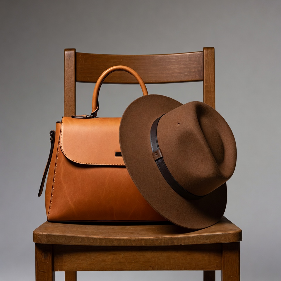 accessories, brown handbag, brown hat, chair, fashion, fashion accessory, fedora hat, hat, isolated background, leather bag, leather hat, luxury bag, product photo, purse, still life, stylish hat, tan leather, wooden chair, handbag