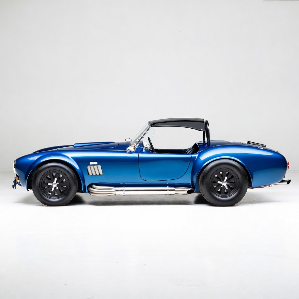 AC Cobra, black top, black wheels, blue car, chrome pipes, classic car, convertible, hood vents, muscle car, roadster, side view, sports car, vintage car, white background, Shelby Cobra