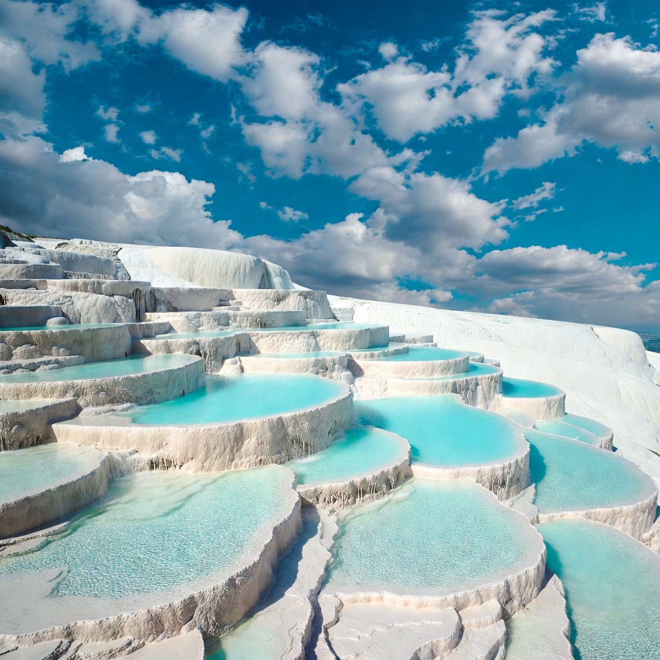 White travertine terraces cascade down a hillside with vibrant turquoise pools of water. Fluffy white clouds dot the clear blue sky above the natural rock formations. The stunning geological site features multiple layered pools glistening in the sunlight.