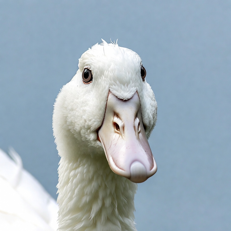 animal face, beak, bird, blue background, close-up, cute duck, duck, eyes, farm animal, feathers, fluffy duck, isolated background, pink beak, portrait, waterfowl, white duck