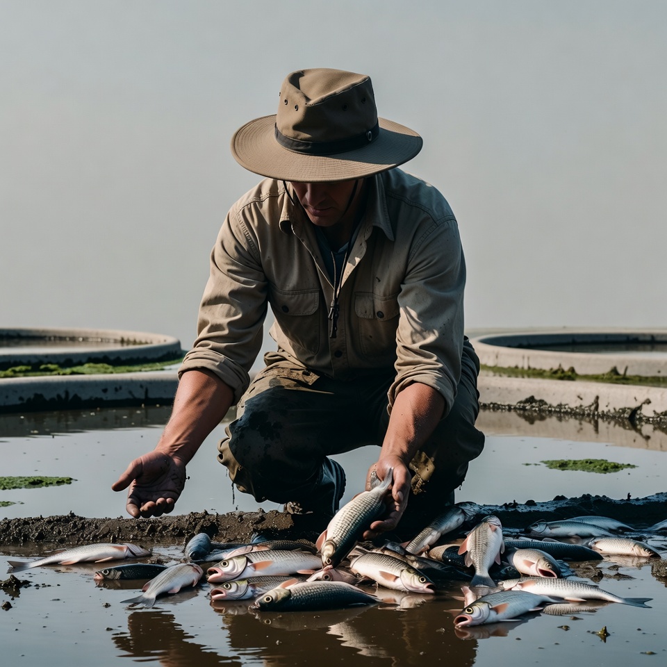 A man wearing a beige hat and khaki shirt kneels by a shallow pond, holding several small silver tilapia fish in his hands. Numerous fish lie on the muddy bottom around him amid shallow water and green algae. Farm ponds with concrete edges are visible in the background under a cloudy sky.